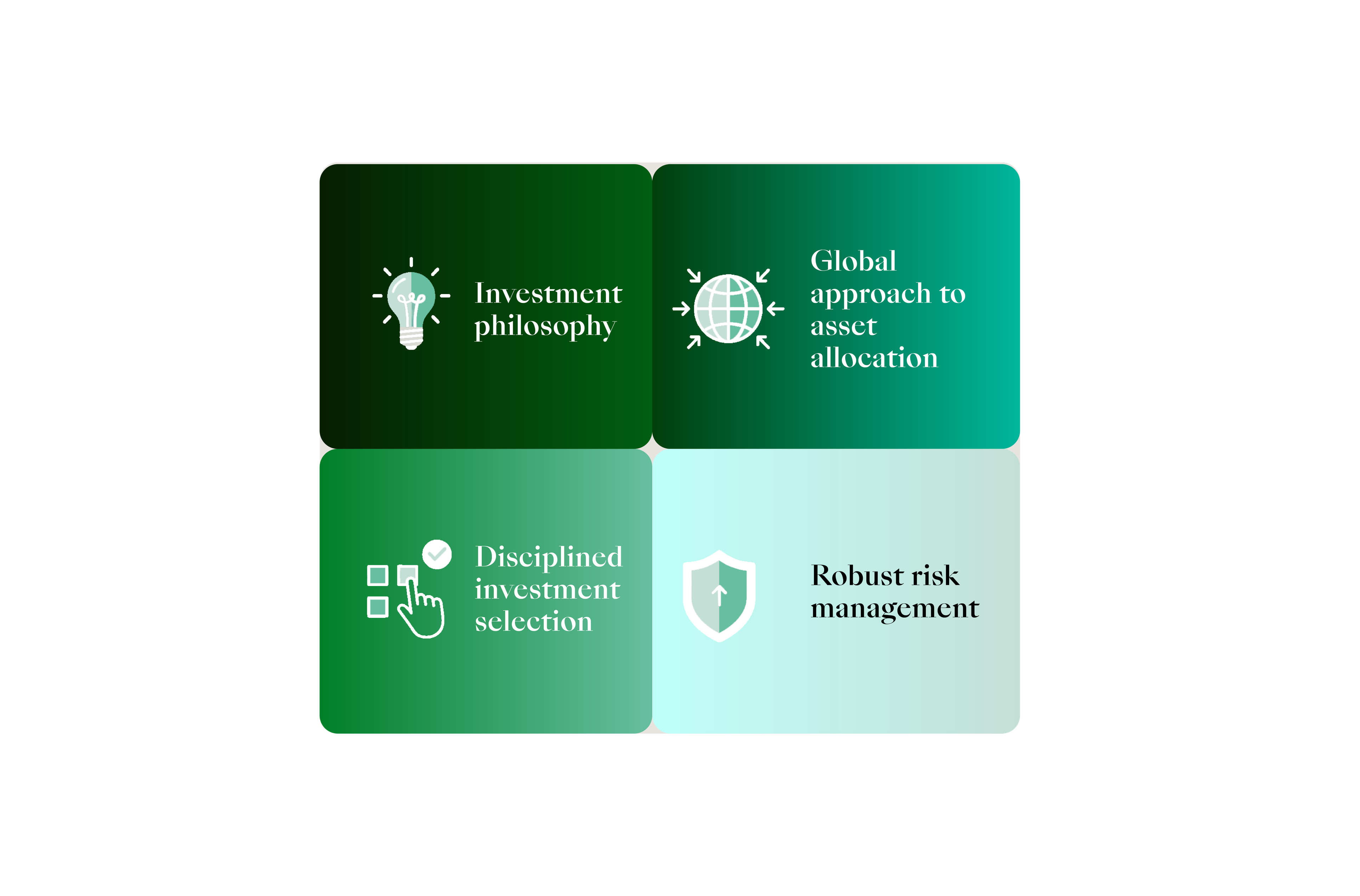 We have a strong investment culture, underpinned by a clearly defined philosophy and disciplined investment process. When constructing portfolios, we draw on extensive in-house expertise across asset allocation, investment selection, and risk management.